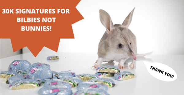 Thanks so much for rallying behind our beloved bilby and supporting our plight to ensure BILBIES not BUNNIES are celebrated at Easter. We will be taking these 30K signatures to Coles and Woolies at the end of May to ask that chocolate bilbies be added to the stock list for Easter 2021. We will keep you updated on our progress, and thanks again!