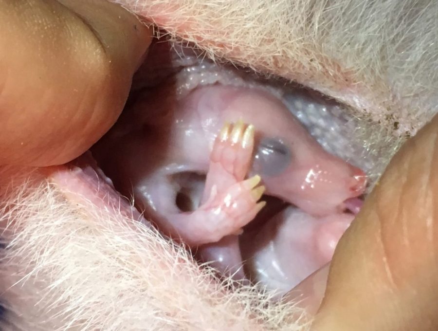 Bilbies’ hind legs are similar in shape to a macropod (kangaroo/wallaby) but with syndactylous (fused) toes and an enlarged fourth digit, making for a very distinct footprint. Their forelegs are extremely strong – right from birth – as they have to use them to climb from the urogenital opening up to their mother’s rear-facing pouch. The pouch is ‘upside-down’ so that when the mother digs, she is not shovelling dirt into her pouch.